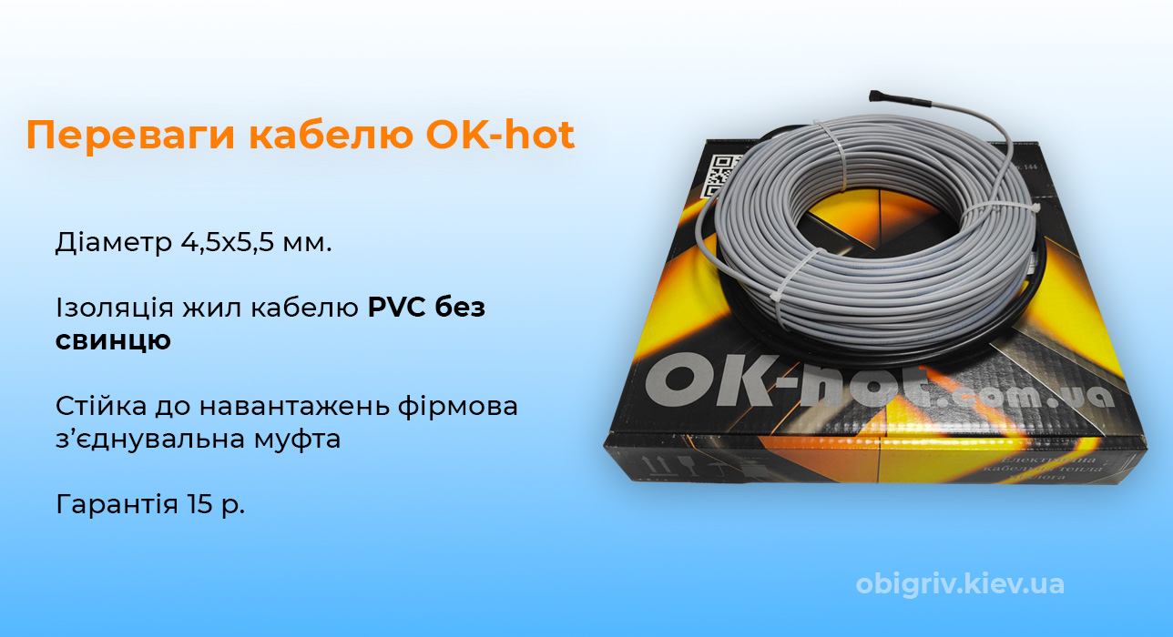 Кабель гріючий OK-hot – це інноваційний продукт від Українського виробника "Одескабель", створений для забезпечення рівномірного та комфортного прогріву підлоги в будь-якому приміщенні. Він поєднує у собі високу якість, безпеку та простоту в установці.