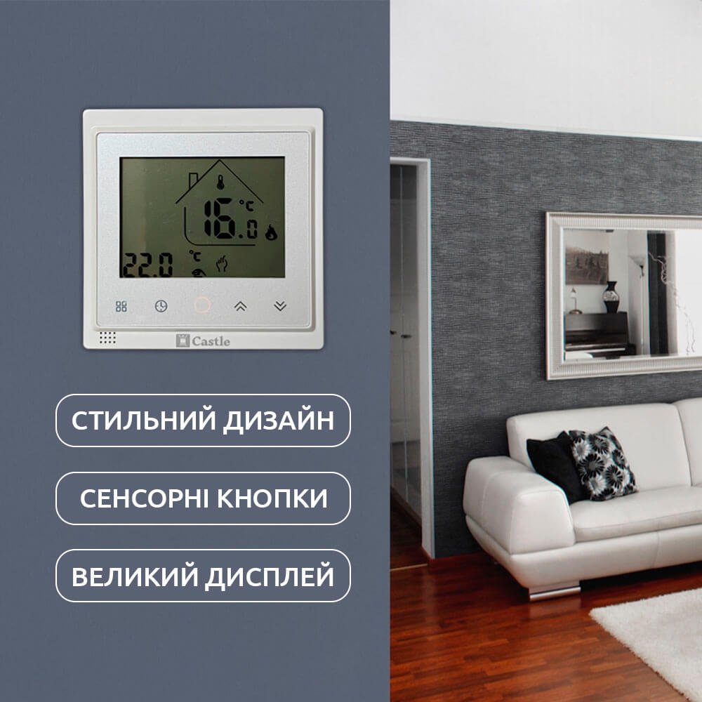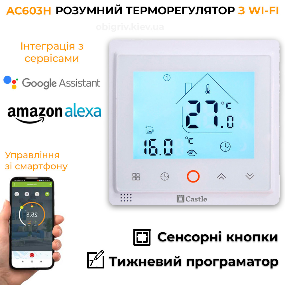 Терморегулятор (програматор) для теплої підлоги AC-603Н – з підтримкою роботи за розкладом. Він оснащений сенсорним дисплеєм та підтримує керування системою опалення через Wi-Fi, а також інтегрується в системи "Розумний дім".