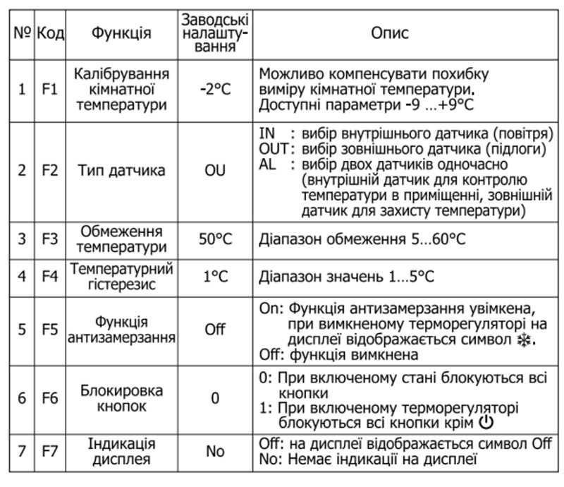 - Вхід у розширені налаштування (при вимкненому термостаті одночасно утримуйте кнопки 1+2 протягом 5с.)