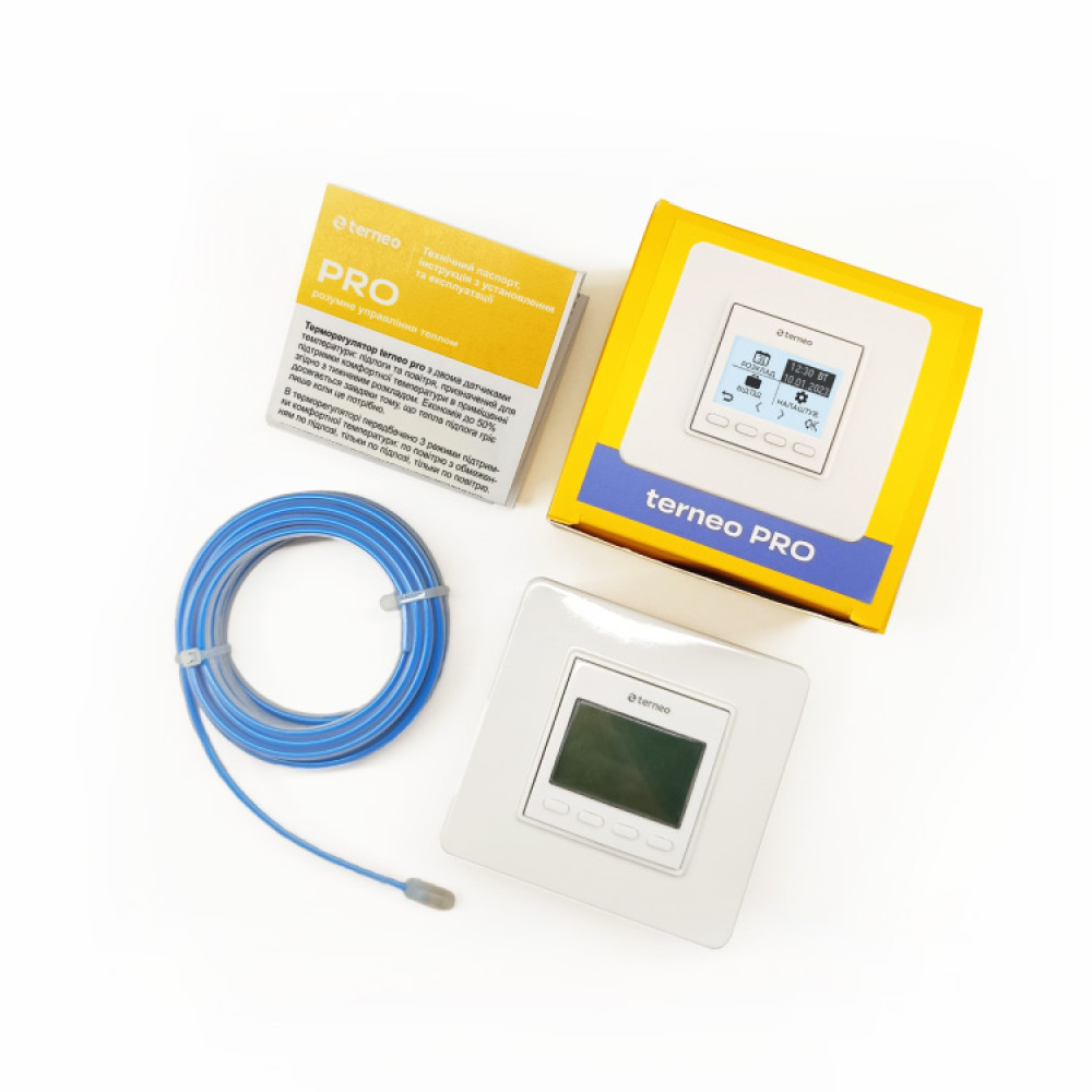 Терморегулятор кімнатний, Terneo PRO це програмований терморегулятор для систем обігріву "тепла підлога", з рідкокристалічним екраном, двома датчиками температури, функцією тижневого програмування обігріву за розкладом в залежності від періоду доби та дня тижня.