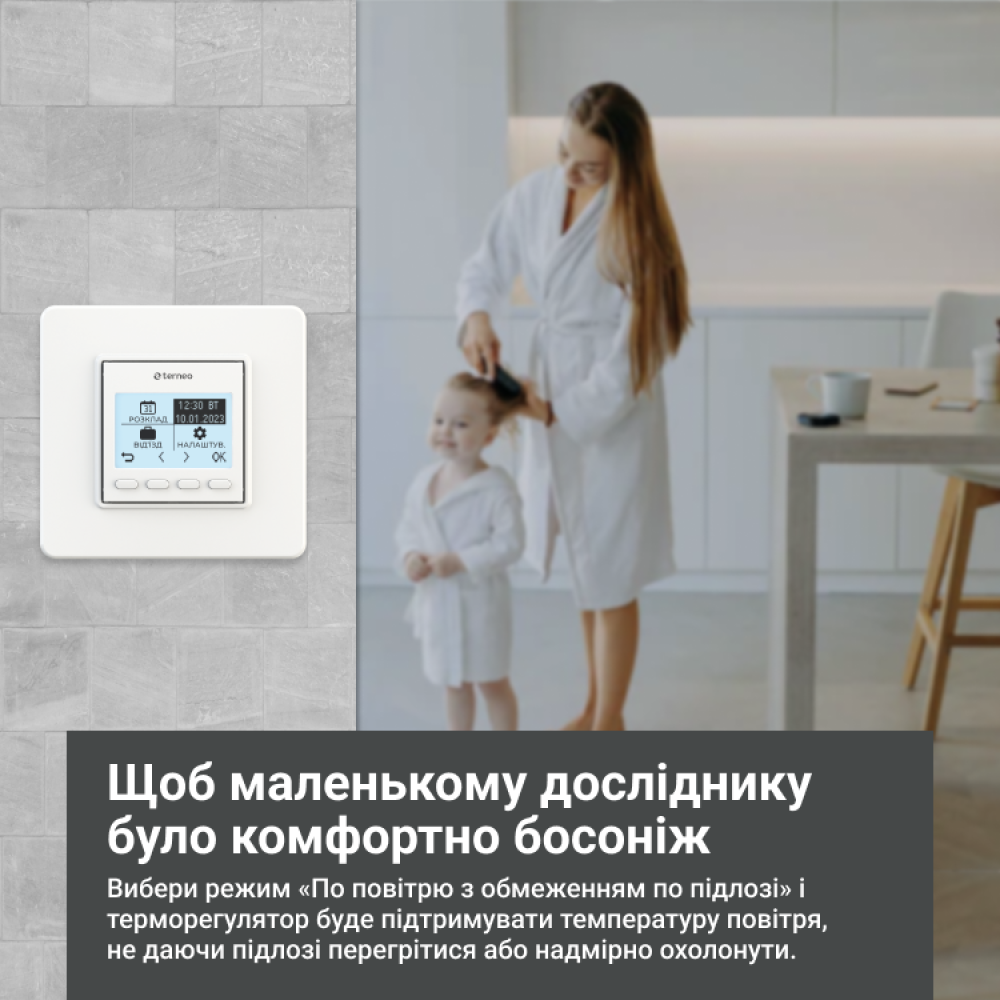 При першому включенні terneo pro крок за кроком проведе вас по основним налаштуванням терморегулятора та заощадить ваш час. Додаткові налаштування використовуйте за бажанням.